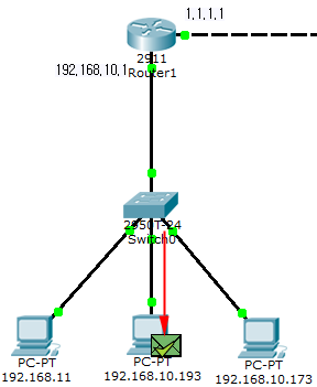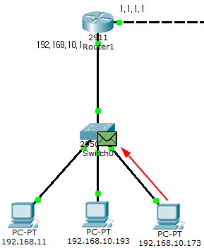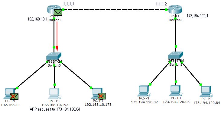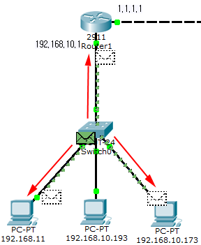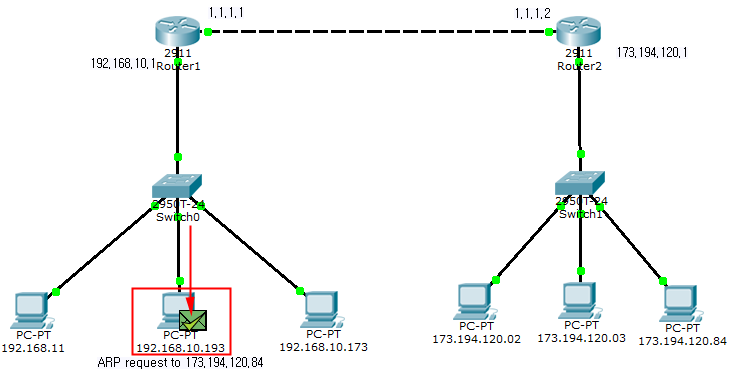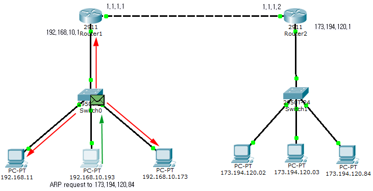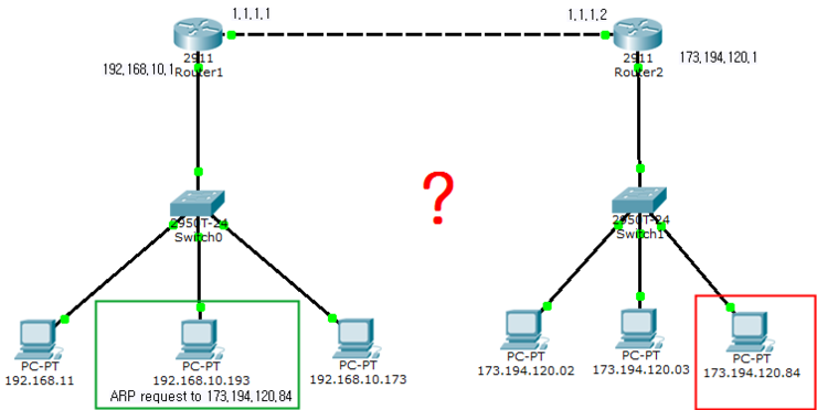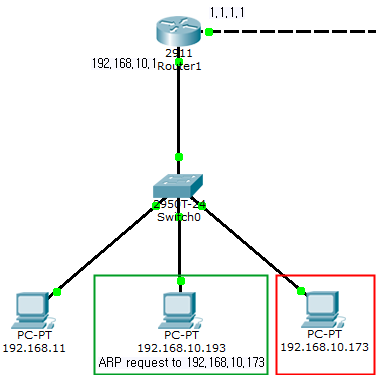 다시 말해, IP 주소가 192.168.10.193인 초록색 PC는 IP 주소가 192.168.10.173인 빨간색 PC와 통신하길 원합니다. 그러기 위해서는 빨간색 PC의 MAC 주소에 대해 알아내야 합니다.
