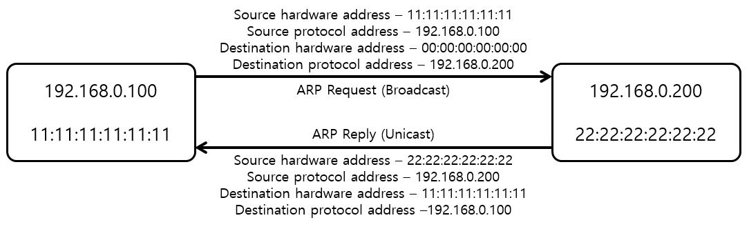 위의 그림으로 설명을 하자면, 왼쪽 네모를 송신자 오른쪽 네모를 목적지라고 가정합시다. 송신자는 본인의 IP 주소와 MAC 주소, 그리고 목적지의 IP 주소만 알고 있습니다. 따라서 목적지의 MAC 주소는 모르므로, 00:00:00:00:00:00으로 테이블을 채운 후 ARP Request를 보냅니다. 목적지는 본인의 MAC 주소인 22:22:22:22:22:22를 테이블에 채워 넣은 후 ARP Reply를 통해 송신자에게 응답을 합니다.