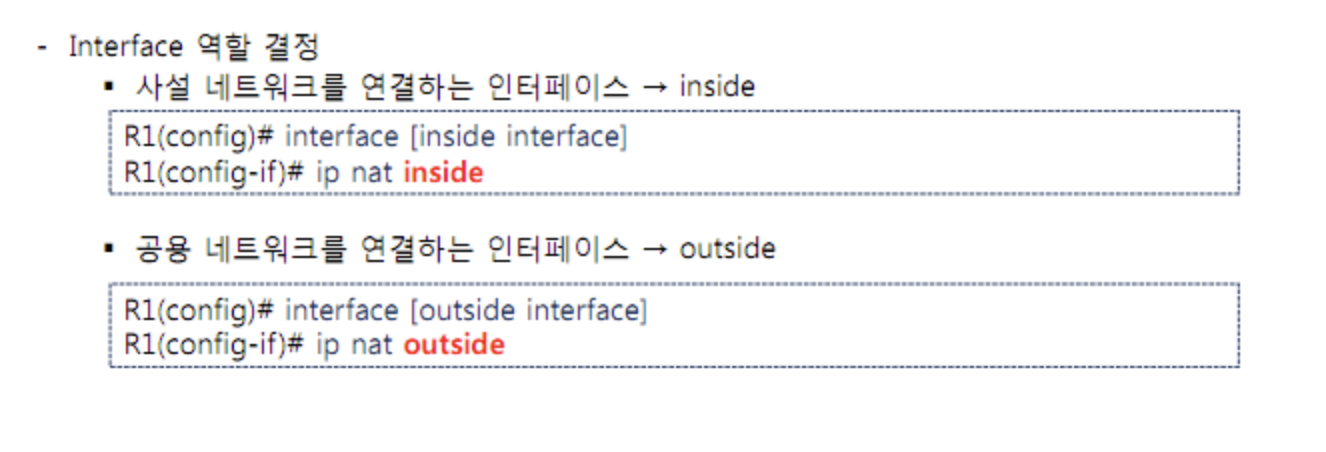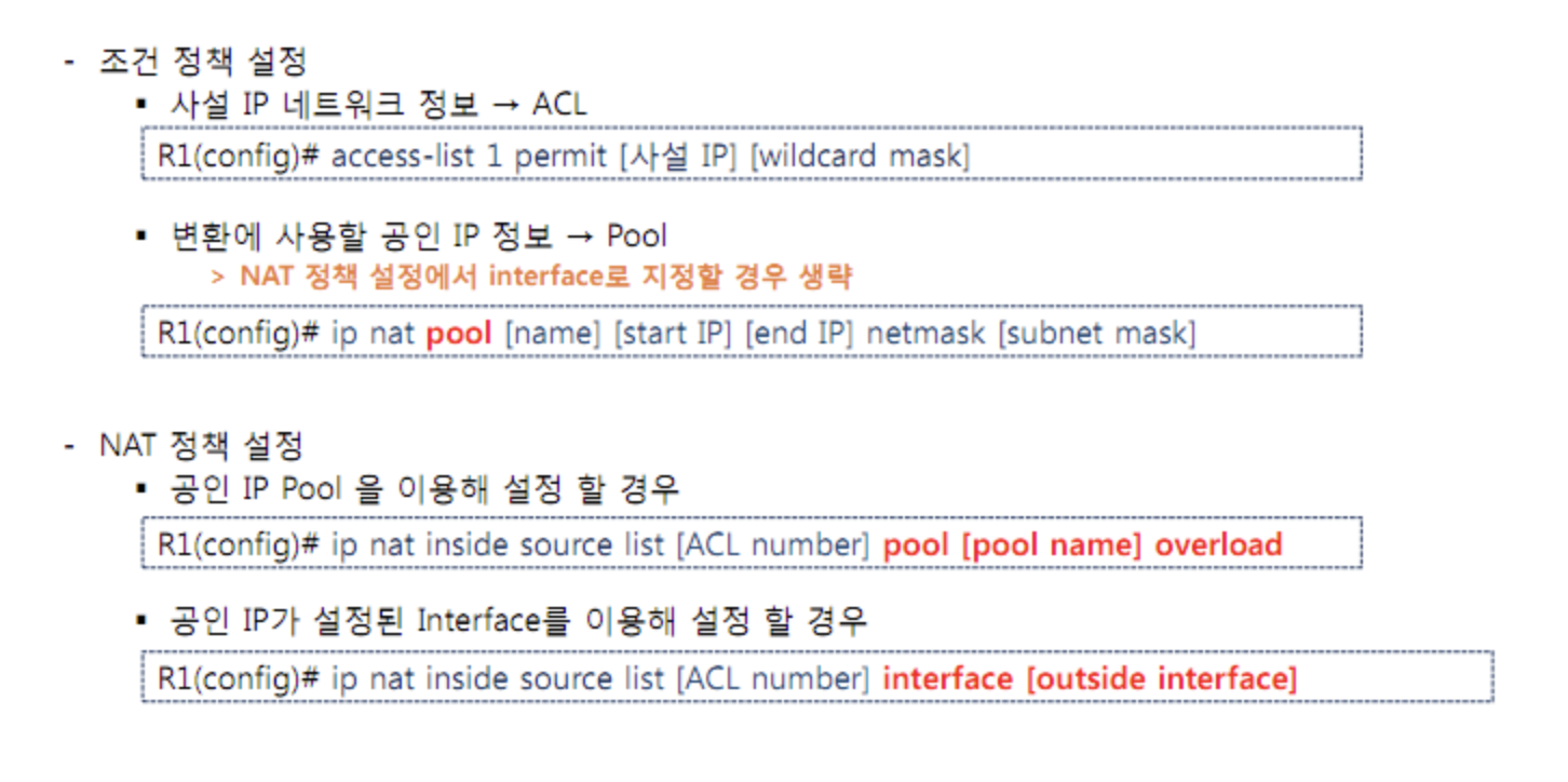 ip nat inside source static tcp {내부에서 사용될 사설 IP} {포트 번호} {오버로드 된 공인 IP} {포트 번호}
