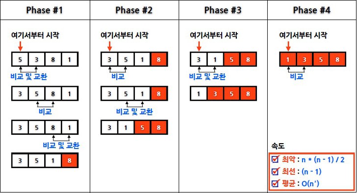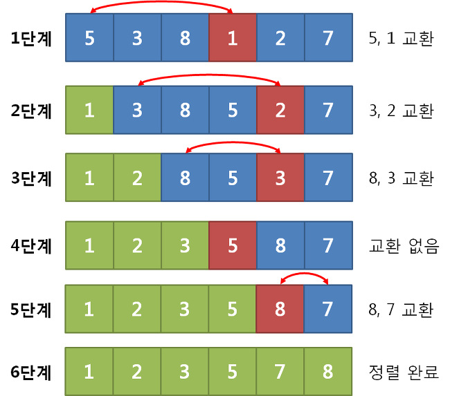 즉 두 개씩 비교하며, (오른차순으로 정렬한다면) 더 작은 값을 왼쪽에 배치하는 정렬이다.