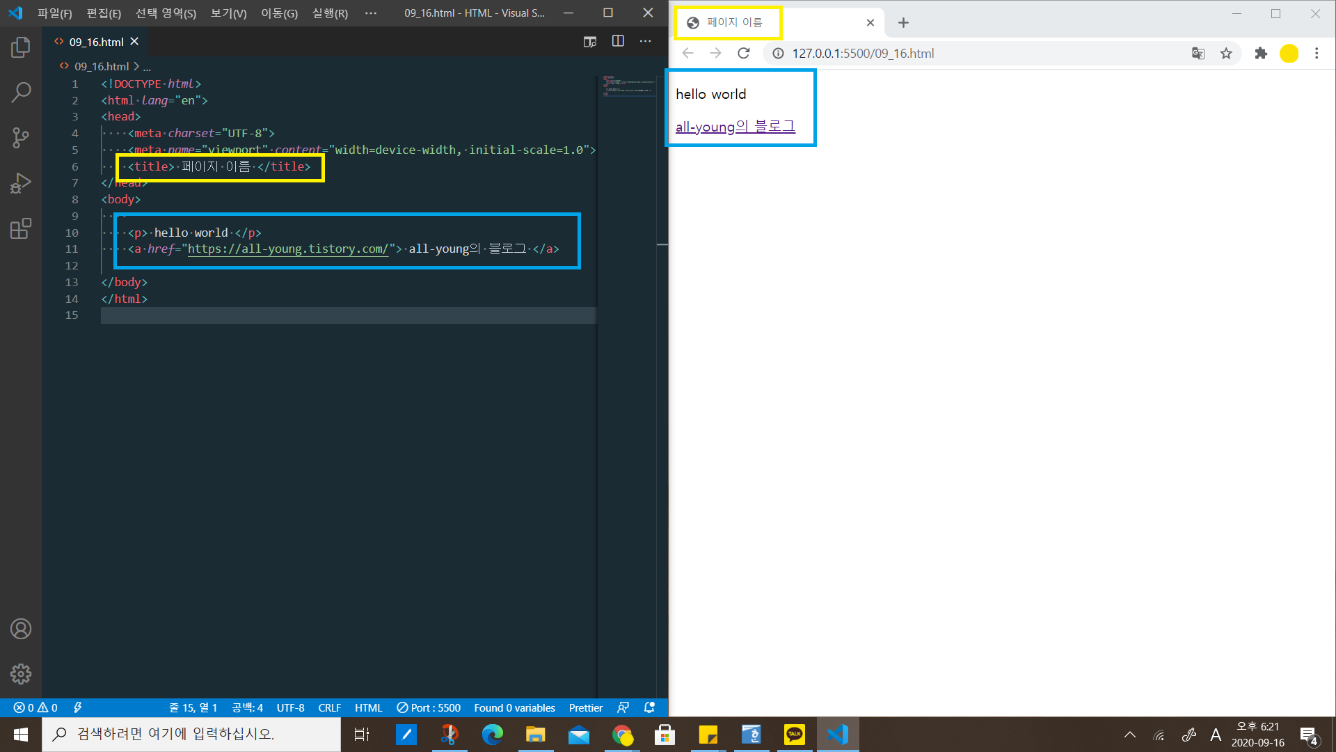 왼쪽에 있는 <title> 과 </title> 사이에 '페이지 이름'이란 글자를 적으니까, 오른쪽의 페이지 이름이 '페이지 이름'이 된 것을 확인할 수 있다.