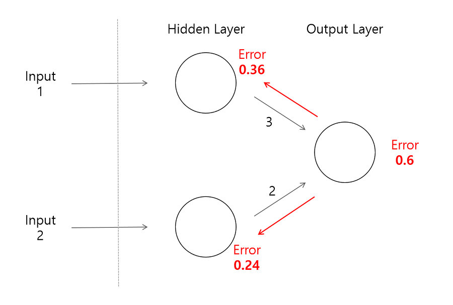 하지만 오차(error)의 값을 줄이기 위해서는 역전파(back propagation)를 이용해야 한다.